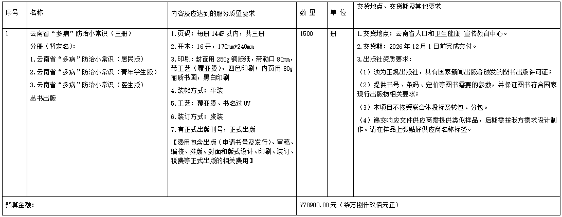 云南省人口和卫生健康宣传教育中心云南省“多病”防治小常识(三册) 出版询价采购公告发表时间:2025-12-19 12:29 项目编号:YNSWSJKXCJYZX-2025-08 参照《中华人民共和国政府采购法》、《中华人民共和国政府采购法实施条例》、《政府采购非招标采购方式管理办法》等有关法律、法规及云南省人口和卫生健康宣传教育中心采购的相关规定,我单位依法对云南省人口和卫生健康宣传教育中心云南省“多病”防治小常识(三册) 出版询价方式采购,本项目采购计划已获得中心主管领导批准,资金已落实。欢迎具有相应资格及供货能力的投标人参加投标。 1.项目概况 1.1项目名称:云南省人口和卫生健康宣传教育中心云南省“多病”防治小常识(三册) 出版询价采购 1.2 项目编号:YNSWSJKXCJYZX-2025-08 1.3 采购方式:询价采购 1.4 资金来源:财政项目资金 1.5采购内容及预算金额:78900元 供应商必须对所有采购内容进行整体报价,总报价超过预算控制价的均为无效报价。本项目报价包含设计、制作、税费、运输等一切费用。 1.6质量要求:满足国家现行规范及行业标准相关规定。 2.供应商资质要求 2.1必须符合《中华人民共和政府国采购法》第二十二条规定:供应商参加政府采购活动应当具备下列条件: (一)具有独立承担民事责任的能力; (二)具有良好的商业信誉和健全的财务会计制度; (三)具有履行合同所必需的设备和专业技术能力; (四)有依法缴纳税收和社会保障资金的良好记录; (五)参加政府采购活动前三年内,在经营活动中没有重大违法记录 (六)法律、行政法规规定的其他条件。 采购人可以根据采购项目的特殊要求,规定供应商的特定条件,但不得以不合理的条件对供应商实行差别待遇或者歧视待遇。 供应商递交以下资料用牛皮纸文件袋密封:1.资质文件2.报价文件3.样品。 2.1.1具有独立承担民事责任的能力,提供三证合一的统一社会信用代码营业执照、银行开户许可证、法人身份证复印件、法人授权委托书、经办人身份证复印件; 2.1.2具有良好的商业信誉和健全的财务管理制度,财务状况良好。 2.1.3具有依法缴纳税收和社会保障资金的良好记录。 2.1.4参加政府采购活动前3年内,在经营活动中没有重大违法记录,提供书面声明(重大违法记录,是指投标人因违法经营受到刑事处罚或者责令停产停业、吊销许可证或者执照、较大数额罚款等行政处罚); 2.1.5信誉要求:投标人未被列入“信用中国”网站(www.creditchina.gov.cn)失信被执行人或重大税收违法案件当事人名单,和“中国政府采购网”(www.ccgp.gov.cn)“政府采购严重违法失信行为记录名单”。信用信息查询结果应为从上述网站获取的查询结果原始页面的打印件或完整截图; 2.1.6报价文件 **一次报价。为确保公平竞争,报价文件提交后供应商不得对报价文件进行修改。 以上供应商递交资料不退,2.1.1至2.1.6以A4纸张复印并加盖章。 2.2其它 2.2.1根据《中华人民共和国政府采购法实施条例》第十八条规定,法定代表人为同一人或者存在控股管理关系的不同单位不得同时参加本项目的投标。 2.2.2本次采购不接受联合体投标。 3.响应文件的递交 3.1 响应文件递交地点:白马小区澄碧巷6号云南省人口和卫生健康宣传教育中心二楼总编室。 3.2 响应文件递交有效时间: 现场递交:2025 年12月 23日9:00至11:30止 。逾期送达或者未送达指定地点的响应文件,视为撤回投标文件,采购人不予受理。 4.采购信息发布媒体 采购信息、成交公示均在云南省人口和卫生健康宣传教育中心门户网站公布(www.ynjkjy.com)。云南省人口和卫生健康宣传教育中心采购小组接收响应文件后,召开本中心采购小组会议审核并确定成交单位。成交单位收到成交通知书后3个工作日内须与采购方签订供货合同。 5.未尽事宜在合同中进一步明确。 6.联系方式 采购方:云南省人口和卫生健康宣传教育中心 联系人:李老师 电话:65333355 采购人不提供投标响应文件制作等咨询服务。 |