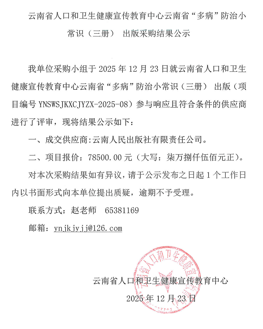 云南省“多病”防治小常识(三册)出版采购结果公示