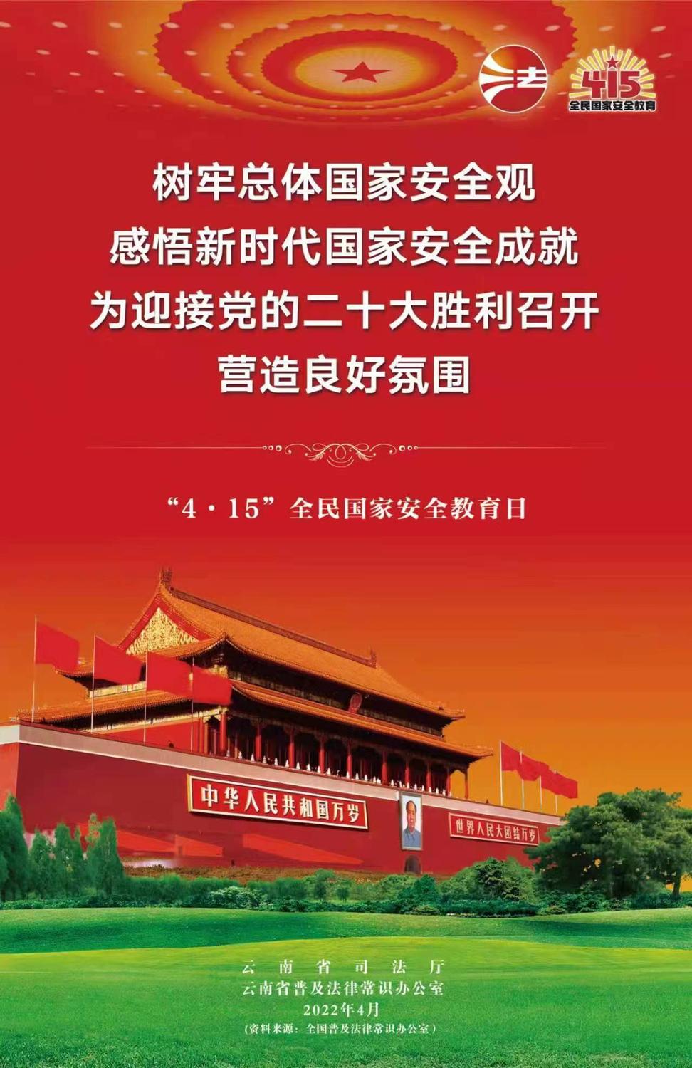 “4•15全民国家安全教育日”宣传标语发表时间:2022-04-11 14:31 1.树牢总体国家安全观,感悟新时代国家安全成就,为迎 接党的二十大胜利召开营造良好氛围 2.安全屏障,同心构筑 3.国家安全一切为了人民、一切依靠人民 4.防范化解各类风险挑战,筑牢国家安全西南屏障 5.法律是维护国家安全的强有力武器 6.安而不忘危,存而不忘亡,治而不忘乱 7.国家安全是安邦定国的重要基石 8.筑牢人民防线,维护国家安全 9.国家安全人人有责,维护国家安全人人可为 10.发展与安全合则兴、离则弱、悖则亡