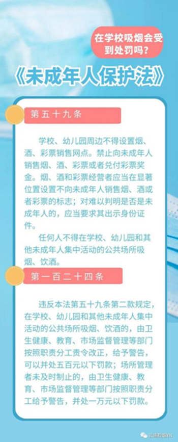 吸烟有害健康,早已成为不争的事实。《中国吸烟危害健康报告2020》指出,吸烟不仅会对个人造成伤害,二手烟暴露、电子烟同样会对健康造成危害。 尤其是对未成年人而言,身体各个器官还处在生长发育中,免疫力也较为低弱,更容易受到烟草烟雾有害物质的影响。在学校等未成年人活动的公共场所吸烟,都会让未成年人被迫吸入二手烟,带来严重的健康后果。 1、1991年,《中华人民共和国未成年人保护法》,规定不得在未成年人集中活动的场所吸烟。 2、1997年,发布《关于在儿童活动场所积极开展不吸烟活动的通知》。 3、2008年,《中小学健康教育指导纲要》明确培养各年龄段学生的健康行为与生活方式,避免被动吸烟,学会拒绝吸烟技巧。 4、2010年,下发《关于进一步加强学校控烟工作的意见》,制定《无烟学校参考标准》。 5、2014年,《关于在全国各级各类学校禁烟有关事项的通知》,禁止在中小学幼儿园内吸烟,严格限制在高等学校内吸烟。 6、2018年,国家市场监督管理总局、国家烟草专卖局联合发布《关于禁止向未成年人出售电子烟的通告》。 7、2019年,国家烟草专卖局、国家市场监督管理总局印发《关于进一步保护未成年人免受电子烟侵害的通告》。 8、2019年,《关于进一步加强青少年控烟工作的通知》由教育部牵头,全力推进无烟中小学校建设。 9、2020年10月17日,第十三届全国人民代表大会常务委员会第二十二次会议第二次修订《未成年人保护法》,自2021年6月1日起施行。
